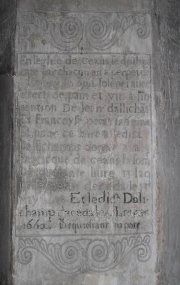 En l'église de céans se doit dire chaque année à perpétuité le 17 Mai un obit solennel avec pain et vin offerts à l'intention de Jean DALLICHAMP et de Françoise PERIN sa femme . Et pour se faire le dit DALLICHAMP donne à la fabrique de céans la somme de 40 livres tournois laquelle PERIN décéda le 13 mai 1638 et le dit DALLICHAMP le 4 juin 1660 (?) . Qu'ils reposent en paix .. |